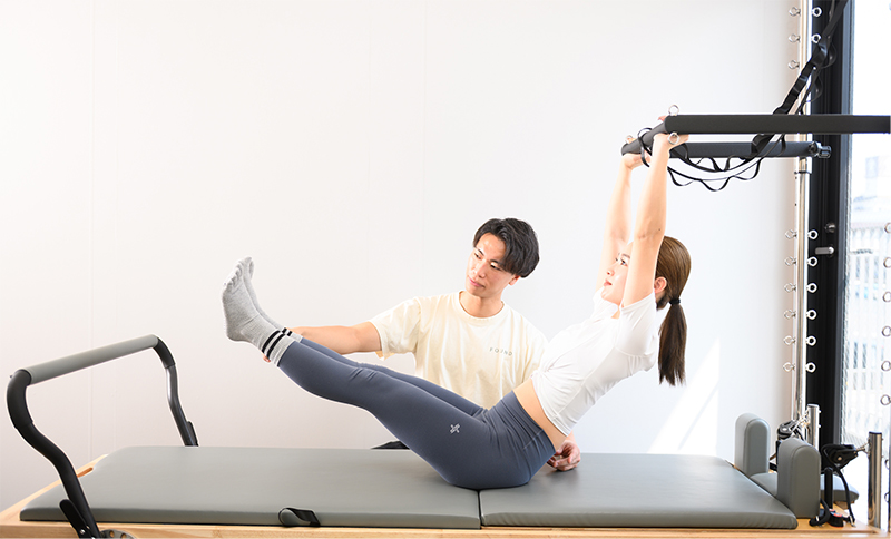 ピラティスでは呼吸の使い方やフォームの正しさが重要なので、まずはパーソナルレッスンで基礎を学ぶ。
