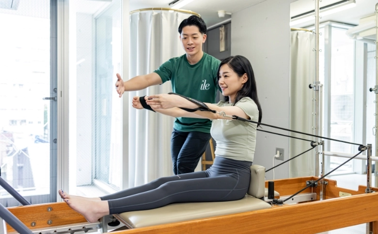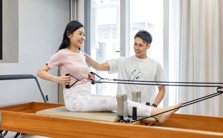 ピラティスでは呼吸の使い方やフォームの正しさが重要なので、まずはパーソナルレッスンで基礎を学ぶ。
